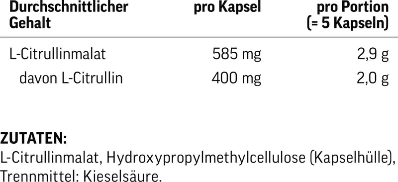 Unser Citrullin-Malat liefert pro Tagesportion 2,9 g reines Citrullin-Malat in veganen Kapseln. Die Rezeptur ist bewusst minimalistisch gehalten: frei von Koffein, DMAA oder unnötigen Zusatzstoffen, mit Kieselsäure lediglich als technologischem Hilfsstoff. Entwickelt und abgefüllt in Deutschland, steht das Produkt für höchste Qualitätsstandards. So erhältst du ein reines und transparentes Aminosäuren-Supplement, das sich unkompliziert in deinen Alltag integrieren lässt.