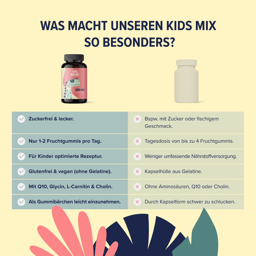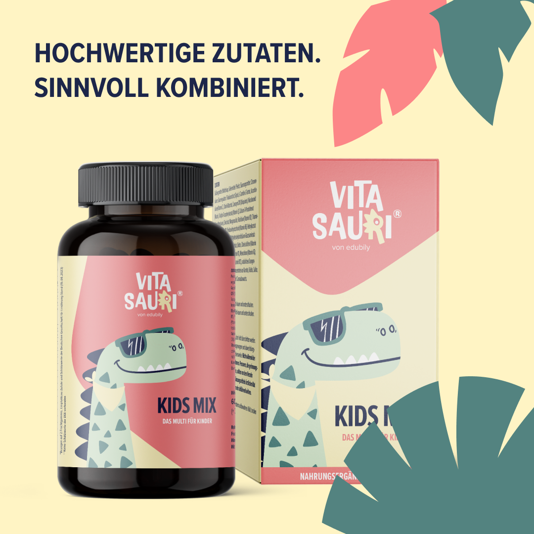 Die Kids Mix Gummis sind ein Multivitamin für Kinder in Form von fruchtigen Dino-Gummis. Enthalten sind 11 Vitamine, 9 Mineralstoffe und Spurenelemente sowie weitere hochwertige Zutaten wie Glycin, Carnitin, Q10 und Cholin. Die Dino-Gummis sind zu 100 % vegan, enthalten keine tierische Gelatine und keinen zugesetzten Zucker, sondern werden mit Maltitsirup und natürlichen Aromen hergestellt.