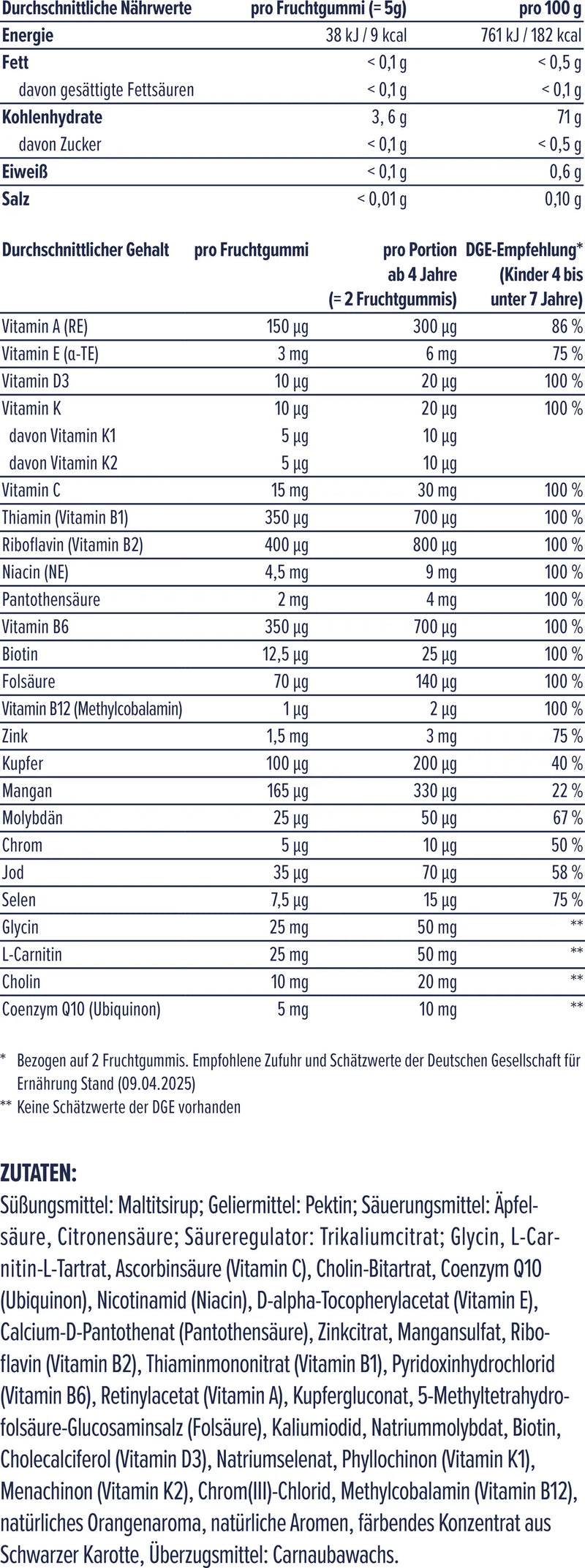 Unsere Rezeptur wurde auf wissenschaftlicher Basis entwickelt und enthält Nährstoffe in sorgfältig ausgewählter und für Kinder sicherer Dosierung. Dabei setzen wir auf hochwertige Verbindungen: echtes Vitamin A in Form von Retinol, aktives Folat (5-MTHF), Vitamin K1 und K2 sowie Mineralstoffe in organischen Formen. Dank der Gummiform lassen sich die Nährstoffe spielerisch in den Alltag einbauen.