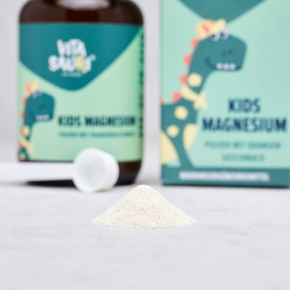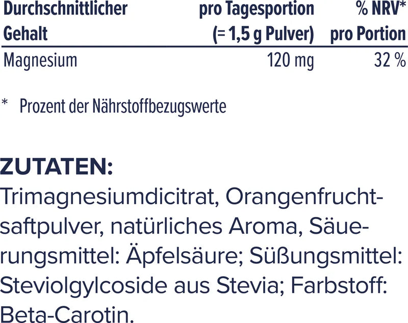 Wir verwenden Trimagnesiumdicitrat. Dieses hat als besonders hochwertige Form einen hohen Anteil an elementarem Magnesium (16 %). Damit Kinder das Magnesium leicht einnehmen können, bieten wir es als Pulver mit fruchtig leckerem Orangegeschmack an. Das Pulver ist ohne Zuckerzusatz. Wir süßen stattdessen mit Stevia.