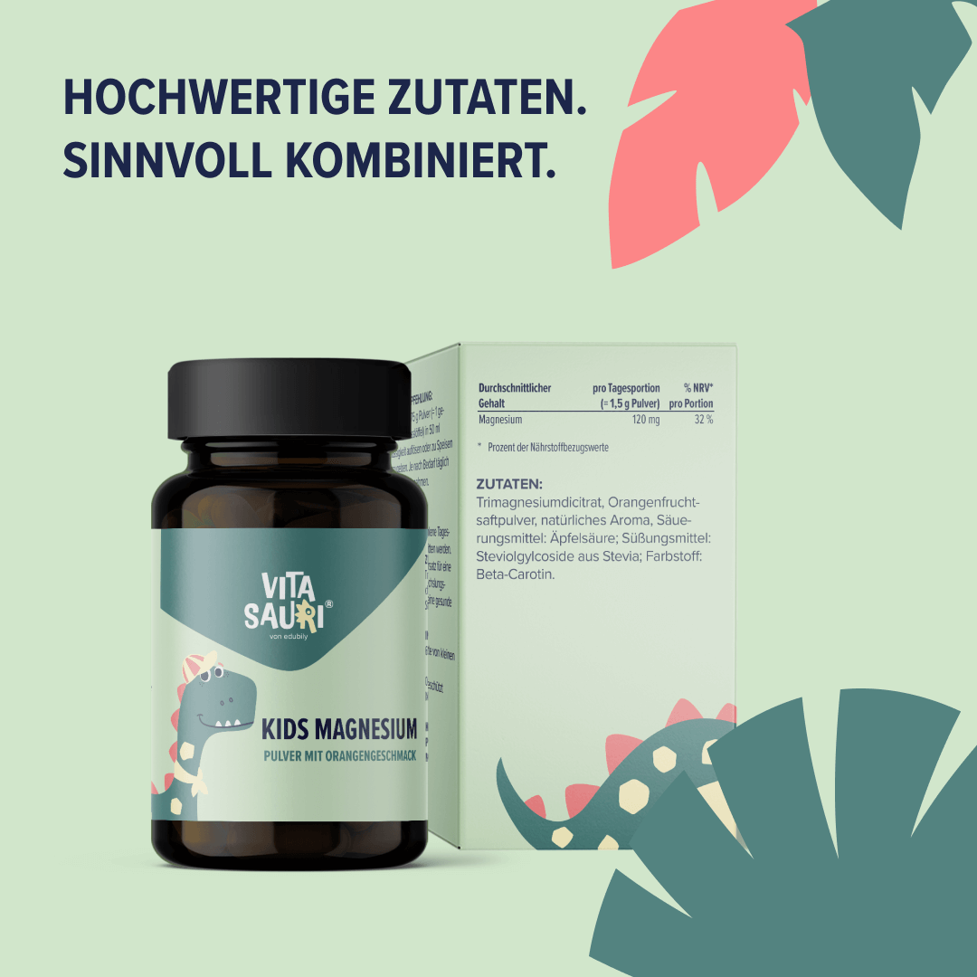 Unser Kids Magnesium verwendet Trimagnesiumdicitrat, eine besondere Form des Magnesiumcitrats mit 16 % elementarem Magnesium. In Pulverform entwickelt, ist es fruchtig im Geschmack dank Orangenfruchtpulver, dabei vegan, zuckerfrei und nur mit Stevia gesüßt. So bietet das Produkt eine kindgerechte Kombination aus einfacher Anwendung, angenehmem Geschmack und geprüfter Qualität.