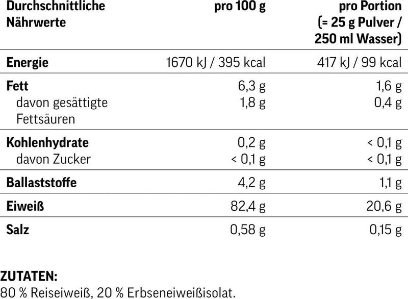 Unser veganes Proteinpulver ist bewusst „clean“ formuliert: keine künstlichen Süßstoffe, stattdessen Geschmacksvarianten mit Stevia und eine komplett neutrale Version ohne jede Süße. Durch die Kombination aus 20 % Erbsenisolat und 80 % Reisprotein erreichen wir einen Chemical Score von 144 – ein Qualitätsmerkmal für die hohe Wertigkeit des Eiweißes.